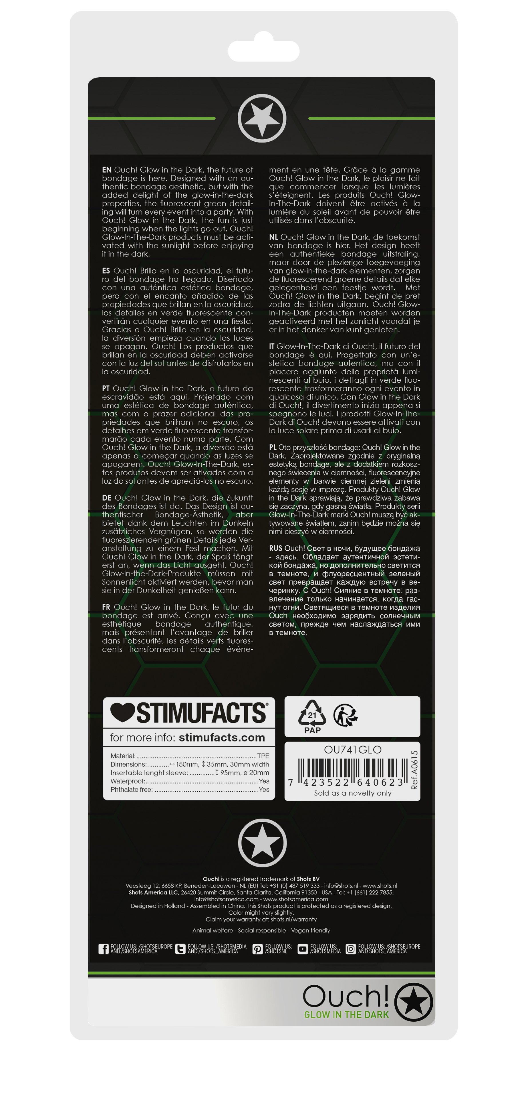 Ouch! Glow in the Dark, the future of bondage is here. Designed with an authentic bondage aesthetic, but with the added delight of the glow-in-the-dark properties, the fluorescent green detailing will turn every event into a party. With Ouch! Glow in the Dark, the fun is just beginning when the lights go out. Are you looking for just a couple of inches more in the most comfortable way possible? Then this is exactly what you need! The thick sleeve is shaped to give optimal stimulation and because of the ball strap it will stay in place. Even your best moves won't make it come off! Ouch!Glow-In-The-Darkproducts must be activated with the sunlight before enjoying it in the dark.