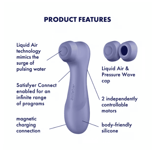 "The Satisfyer Pro 2 Generation 3 Connect App is the ultimate toy when it comes to clitoral stimulation. The successor to the popular Satisfyer Pro 2 is much more than a classic pressure wave vibrator with Air Pulse technology. Thanks to its two motors, you now also have the option of treating yourself to 12 vibration programs. The breathtaking revolution, however, is our innovative Liquid Air Technology: the extra cap with its thin and super-soft silicone membrane creates intense waves that mimic the sensual surge of pulsing water. The Pro 2 Generation 3 floods your body with these pleasure waves, creating a particularly natural feeling and enabling crystal-clear orgasms like you've never experienced before. You prefer to tease your clitoris with the familiar and completely non-contact Air Pulse technology? Since the Pro 2 Generation 3 Connect App comes with two attachments, you always have a choice. Immerse yourself in 11 pressure wave programs, which you can use solo or combine with the toys vibration modes. Thanks to the Satisfyer Connect app, youll enjoy even more variety in your solo sessions: create your own rhythms with the vibration designer, connect your Spotify account and come to the beat of your favorite song, or let your partner control your Satisfyer from anywhere in the world. The app is available for free for iOS and Android."