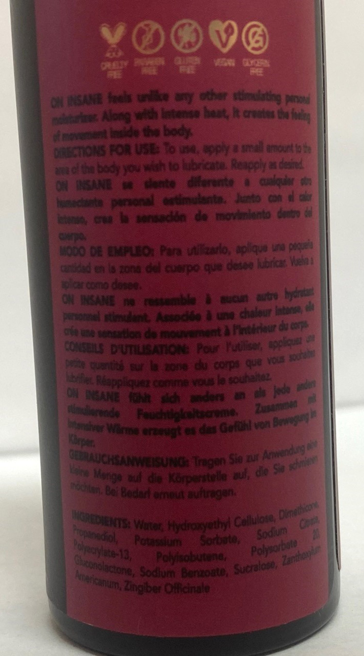 Colorless when applied. ON INSANE feels unlike any other stimulating personal moisturizer youve ever tried. Along with an intense warming feeling, it creates the feeling of movement inside the body. Women can feel an intense sensation using it externally as well. SHAKE WELL before use.