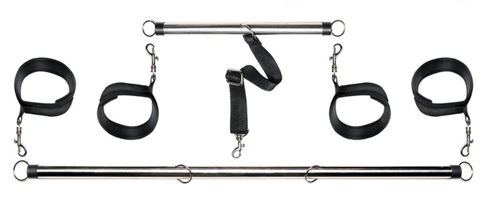 Welcome your lover with open arms and legs with this incredible Spread 'Em Bar and Cuff Set! This kinky set of metal spreader bars will put you or your partner in the right position for pleasure every time. Attach the adjustable wrist and ankle cuffs and your subject will not be able to close their thighs or wrists. Try new positions and scenarios you never dared and do it all with ease, thanks to the swivel-mounted cuffs which allow for some movement. The connecting nylon support strap can also be removed, giving you unlimited possibilities and exciting new positions. They'll squirm around and squeal, but they won't get out! Comes with a handy carrying case too! Open wide!