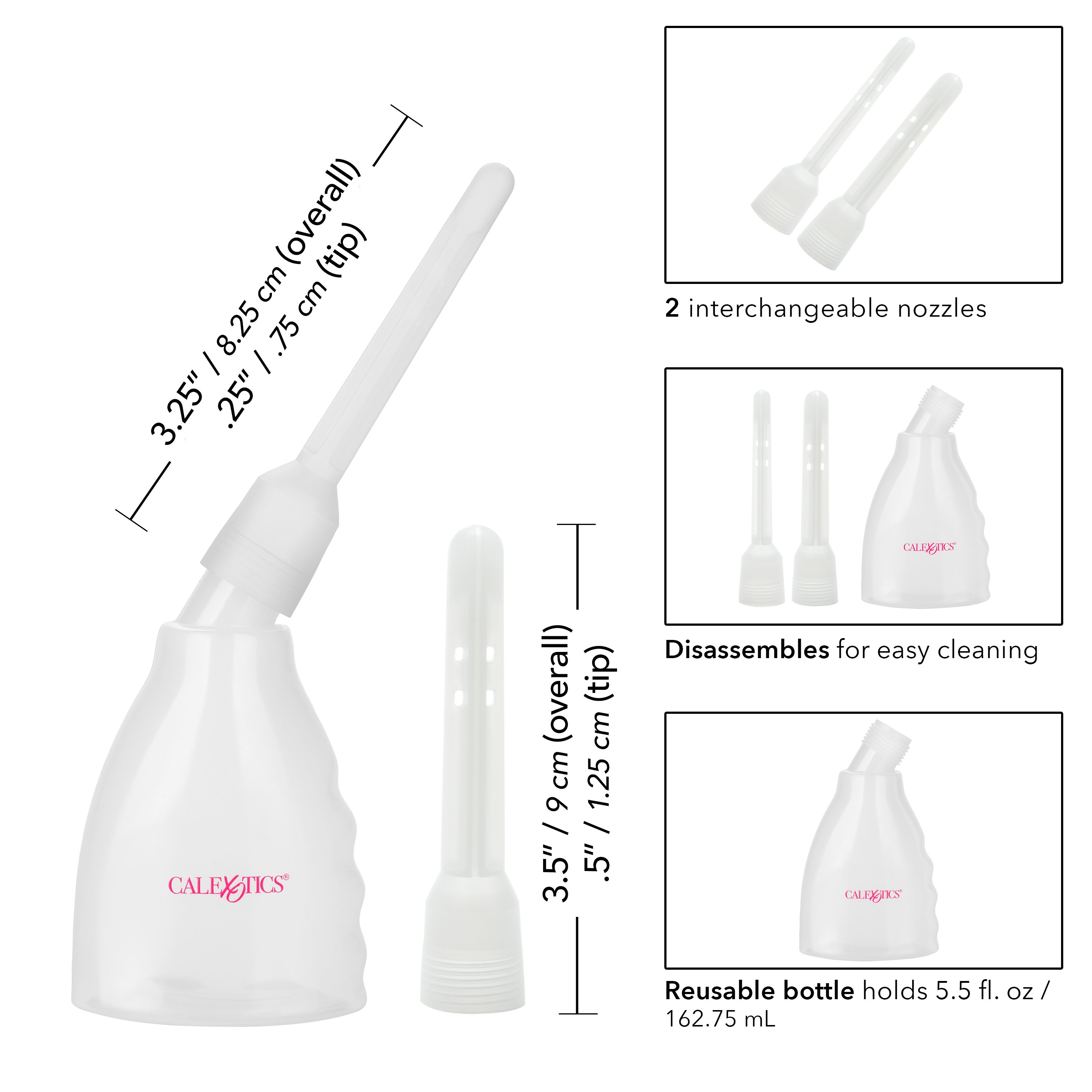 Reusable douche system with transparent bottle and 2 interchangeable nozzles, regular and slim.