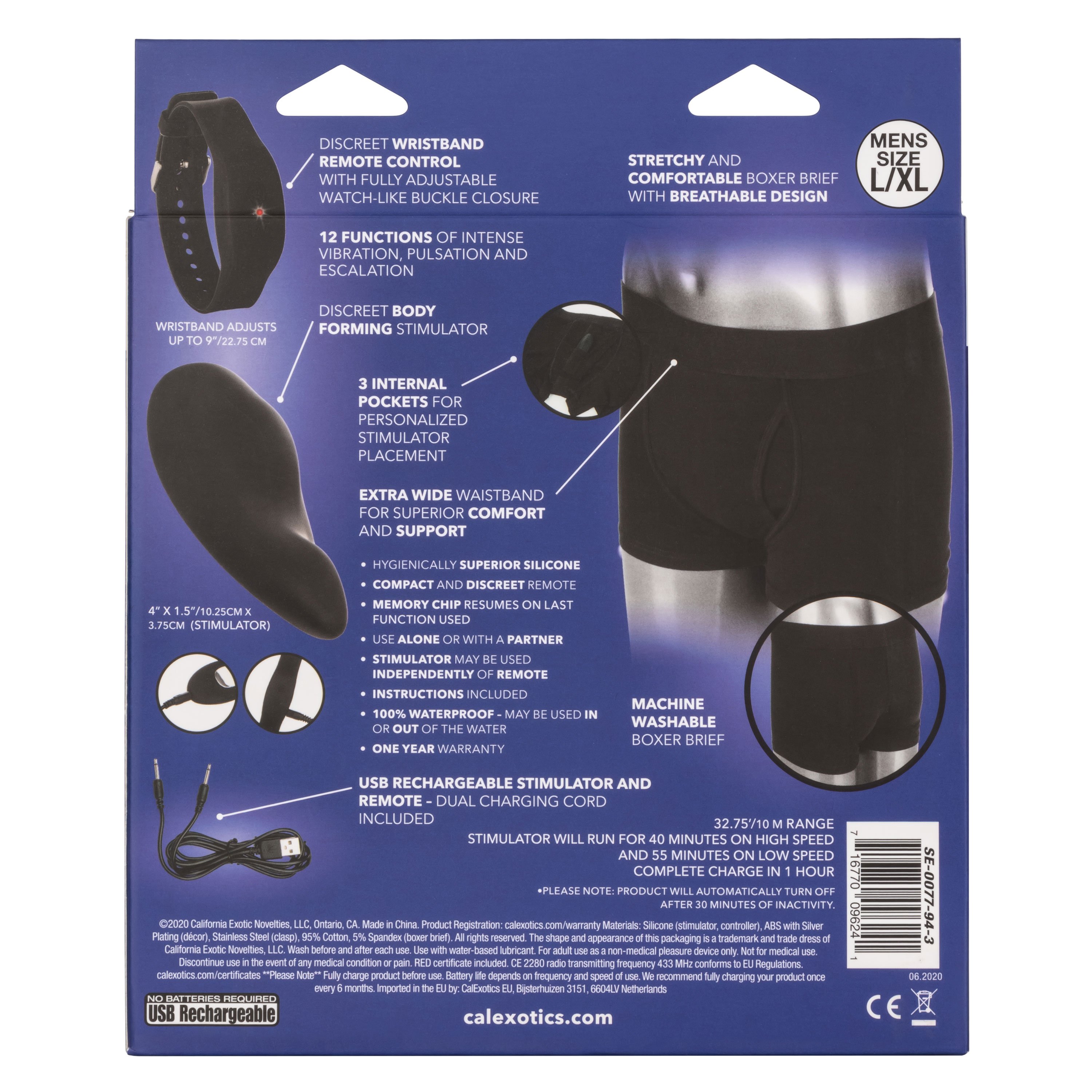 The Remote Control Boxer Brief Set is made for adventurous pleasure seekers, with an extra-comfortable boxer brief paired with a powerfully mini vibrator and discreet wristband controller. The stylish, yet discreet wristband controller makes it easy for you or your lover to control vibration intensity with the touch of a button. Whenever or wherever passion takes you, this passionate min vibrator's 32-foot radius range and 12 intense functions of vibration are ready for playtime. The discreet, form-fitting boxer briefs have 3 internal stimulator pockets for personalized stimulator placement. Made for superior comfort and extended wear, these boxers are made from soft, stretchy fabric with an extra wide waistband.