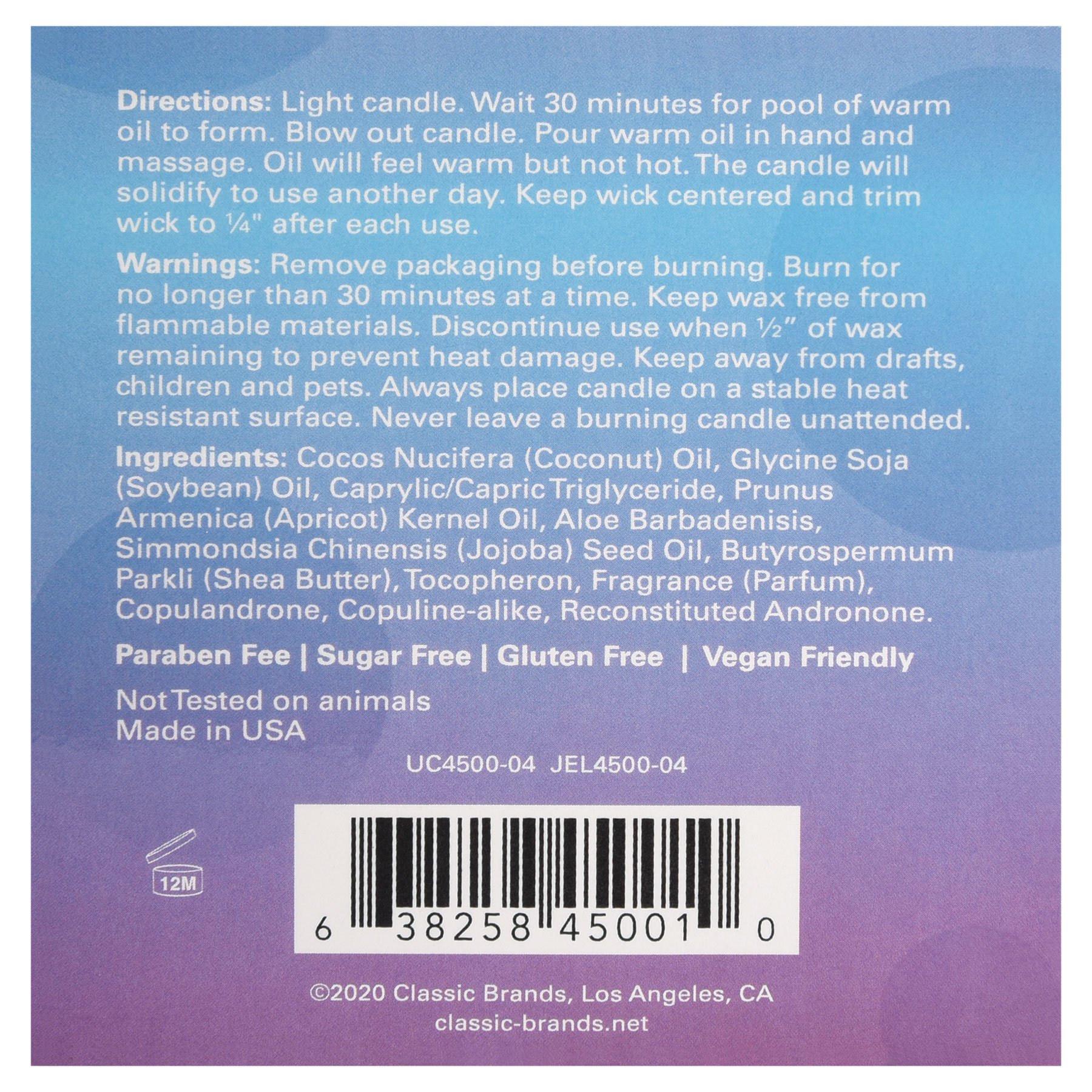 Directions: Light candle. Wait 30 minutes for pool of warm oil to form. Blow out candle. Pour warm oil in hand and massage. Oil will feel warm but not hot. The candle will solidify to use another day. Keep wick centered and trim wick to 1/4" after each use.