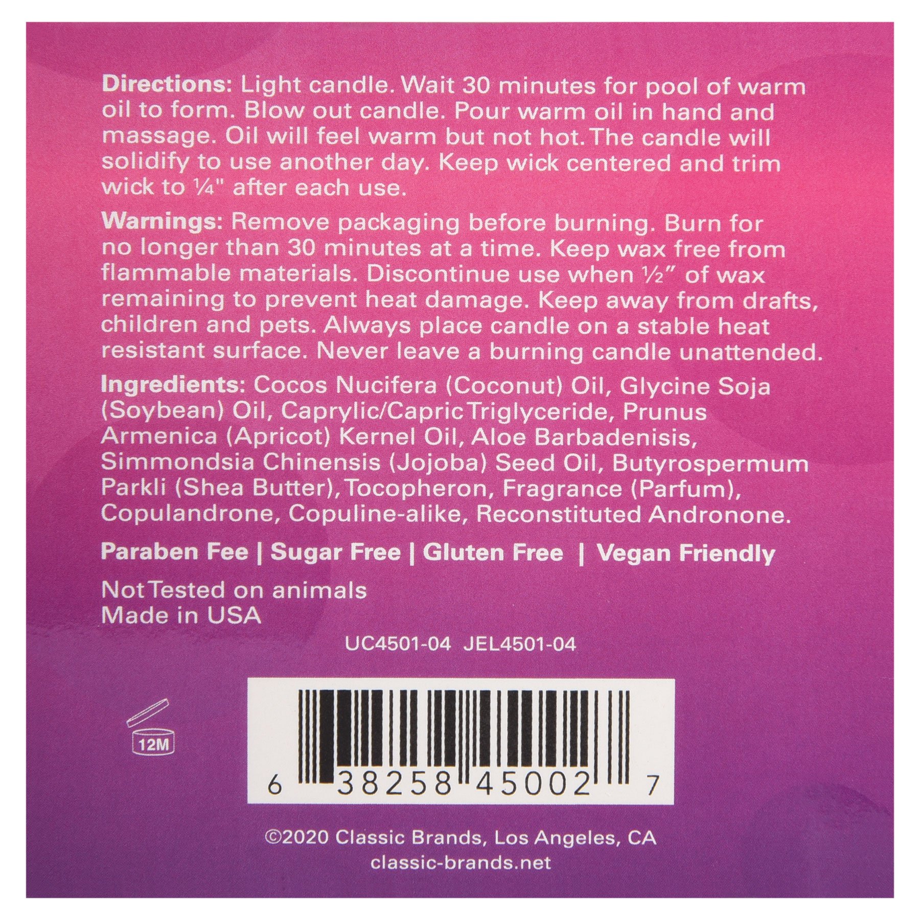 Directions: Light candle. Wait 30 minutes for pool of warm oil to form. Blow out candle. Pour warm oil in hand and massage. Oil will feel warm but not hot. The candle will solidify to use another day. Keep wick centered and trim wick to 1/4" after each use.
